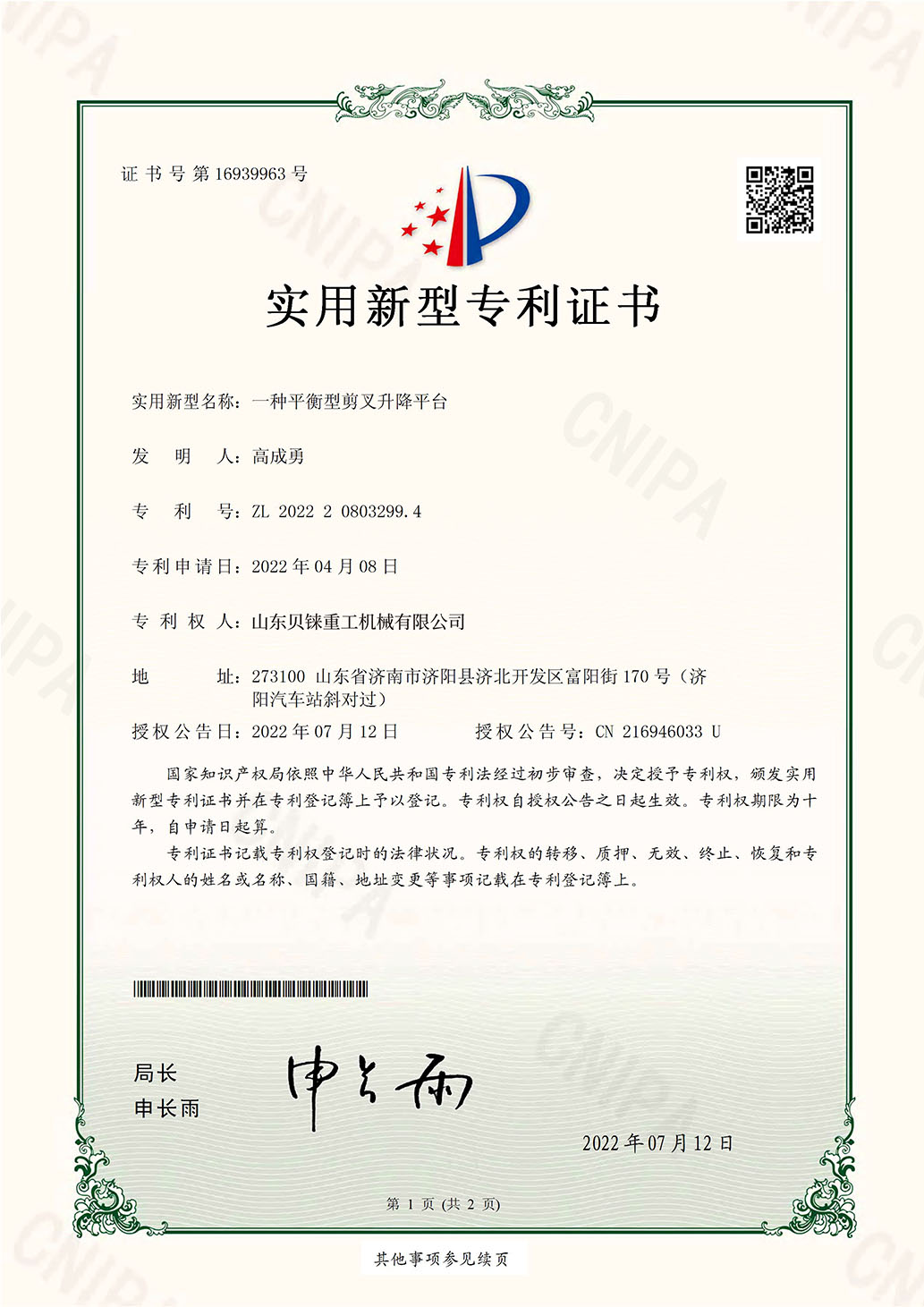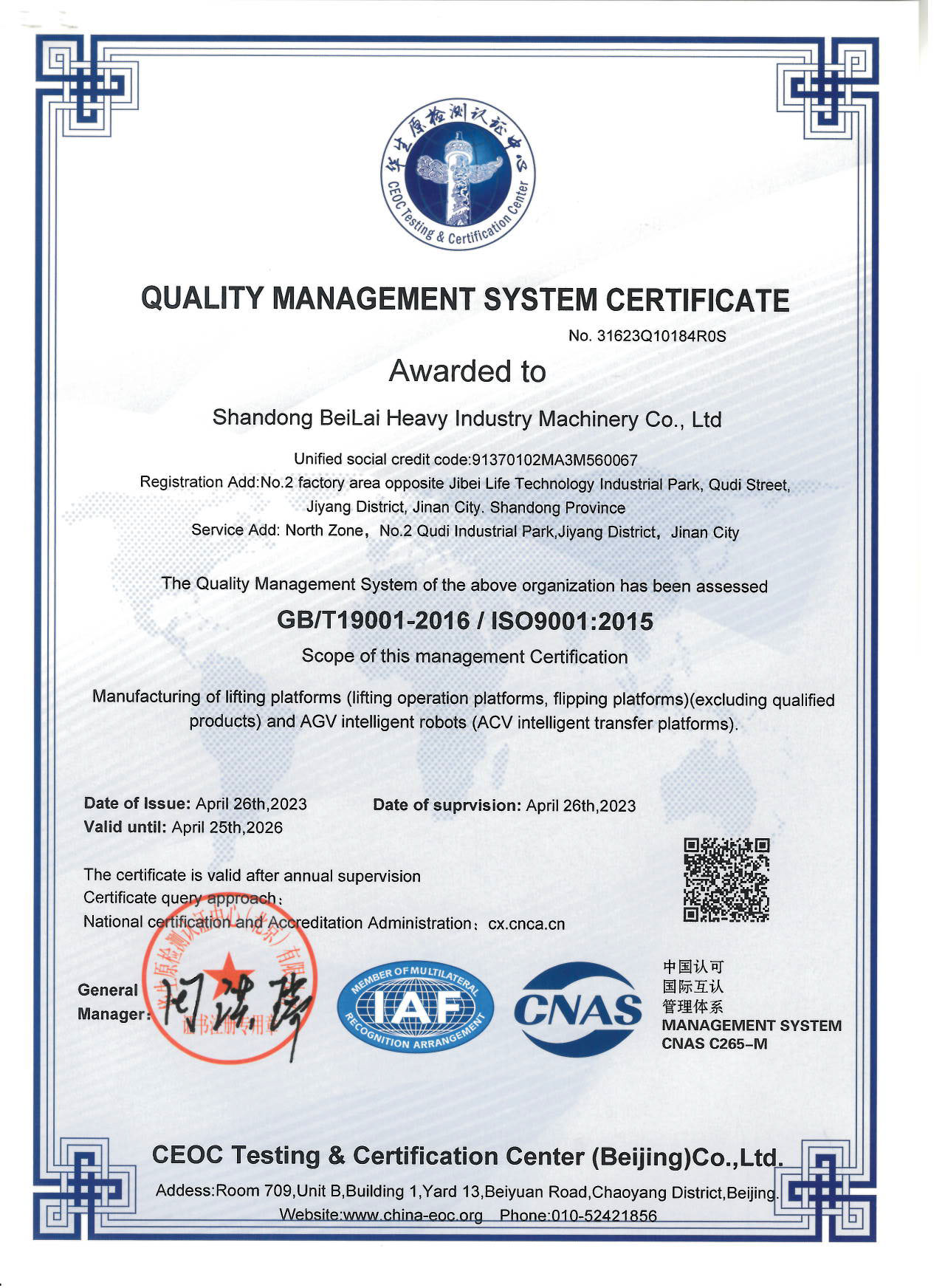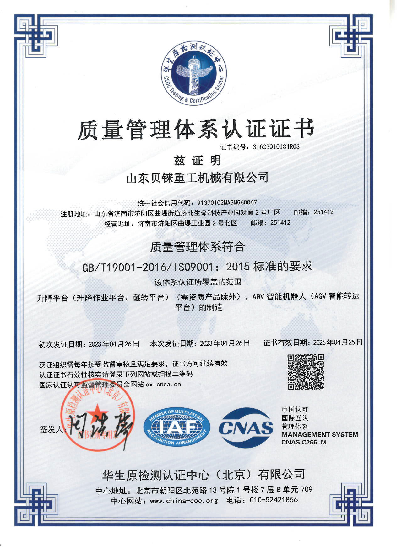 質量體系認證書